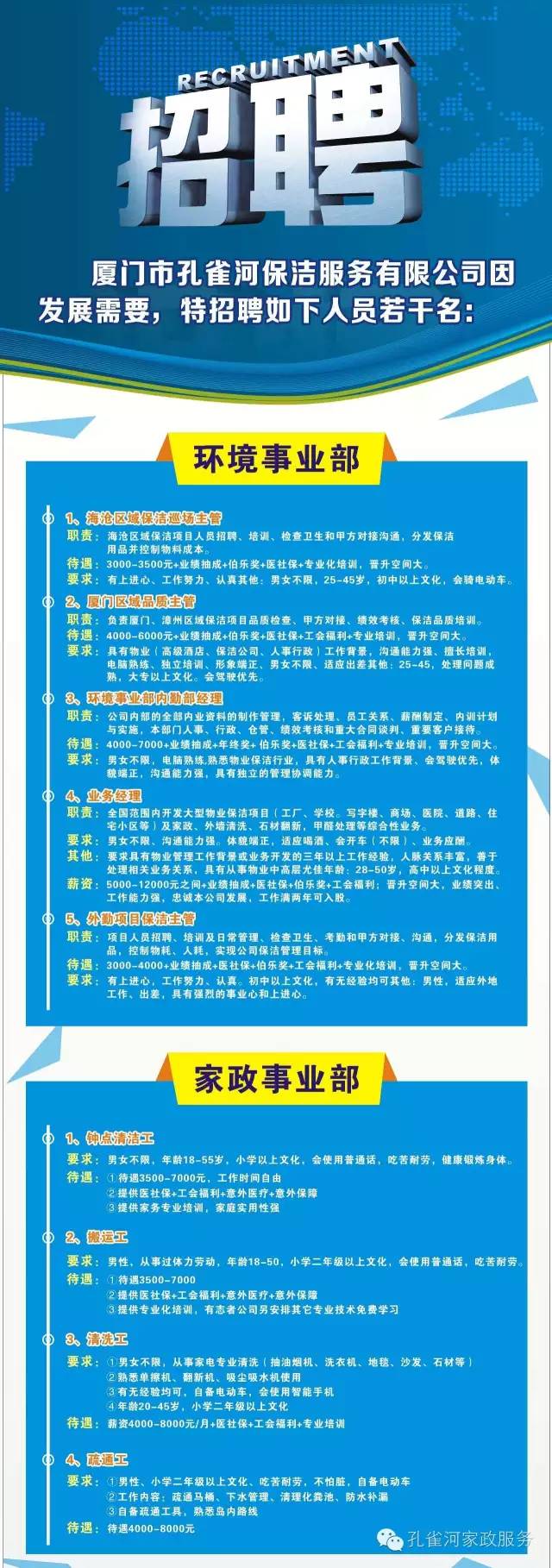 因公司規(guī)模不斷的擴(kuò)大,業(yè)務(wù)不斷的增多,現(xiàn)廈門孔雀河保潔服務(wù)有限公司向社會(huì)有志之士招收一批人才。廈門孔雀和重金招聘